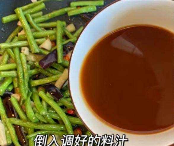 第六步:淋入提前准备好的料汁,盖上锅盖焖煮一会儿,大火收汁,翻炒均匀,出锅,这道鱼香茄子焖豆角就可以开吃了,小白都可以学会,赶快给家里人尝一尝吧。