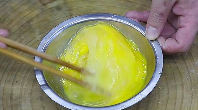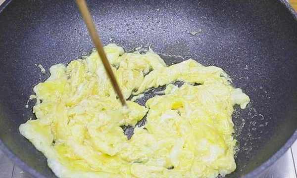 4、锅内再烧油,倒入蛋液小火慢慢炒,已经定型的蛋液先推到一边,一直把蛋液搅至全部凝固,用筷子打散就可以了。这样炒出来的鸡蛋特别嫩滑。