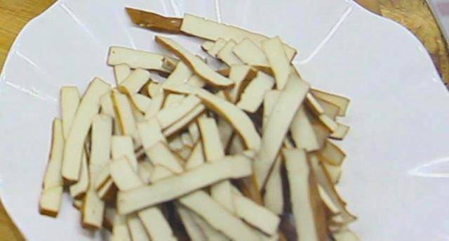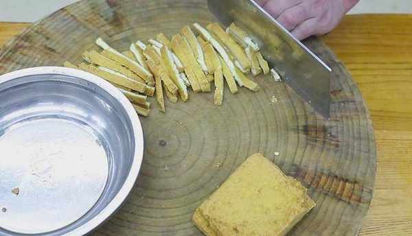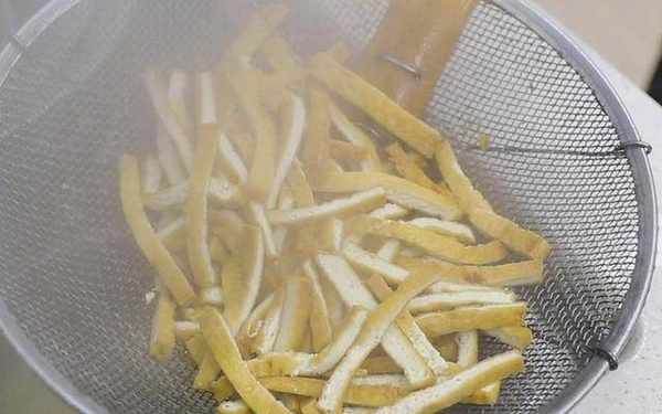3、锅内烧油,油温四成热时放入豆腐片,开小火慢慢炸出豆腐中的水分,但是不能直接把水分炸干,豆腐片炸定型、皮酥黄就可以捞出控油了。炸太狠的话吃起来干硬,不好嚼。然后把控过油的豆腐干切成条备用。