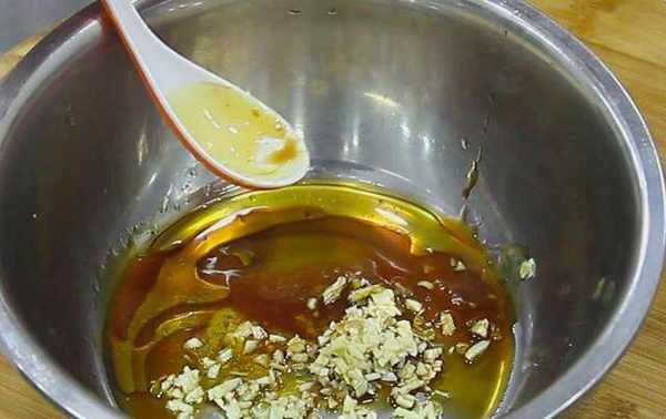 2、把切好的蒜沫放在盆里调一下味,加入食盐,白糖,加入陈醋,可以增强回味,加入芝麻油,增强香醇感,加入辣鲜露,提鲜提辣,没有辣鲜露的,可以用辣椒油代替。