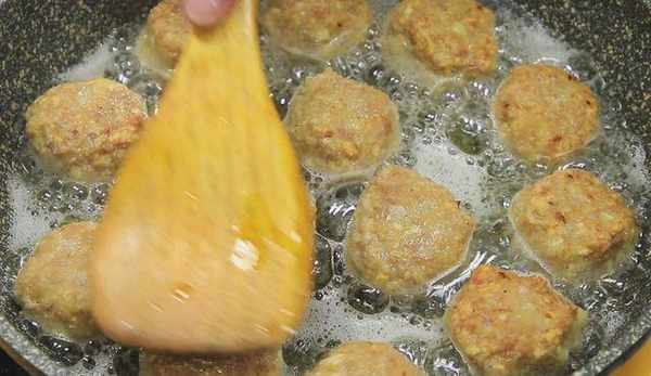 4、锅内烧油,油热以后放入肉丸子慢慢煎,煎3分钟左右,把油倒出来,然后把丸子用木铲按一按,把丸子的面煎到酥脆,口感会更好,再煎2到3分钟,小丸子里面的油慢慢煎出来,吃起来就不会油腻。