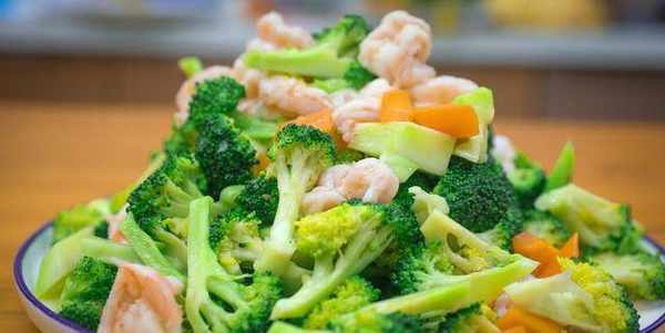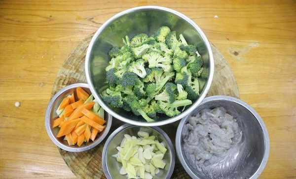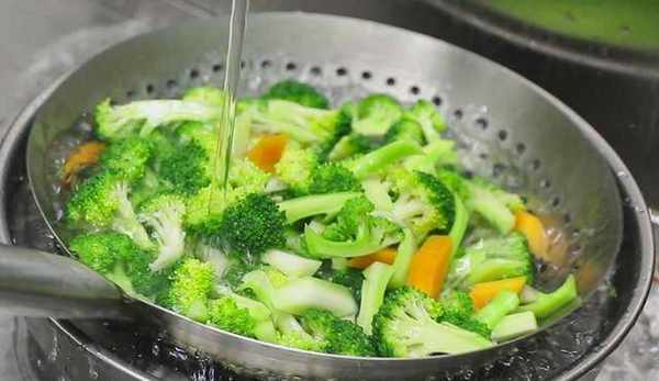 5、继续把锅中的水烧开,放入胡萝卜丁和西蓝花茎,大火汆煮30秒钟,再放入西蓝花煮上三五秒钟,即可出锅。西蓝花煮的久了容易发黄,吃着不够清脆。配菜倒出来以后立即过凉,防止在余温下回软。