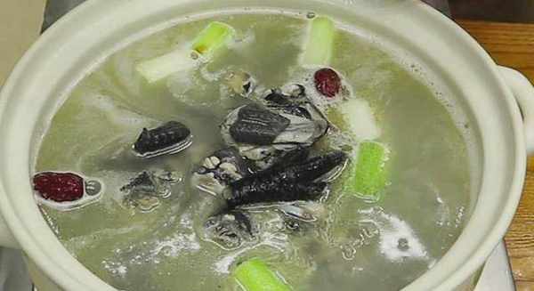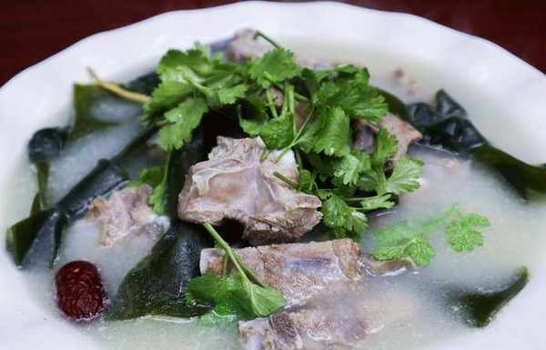 4、沿锅边加入没过排骨的清水,再加入红枣、党参、沙姜,然后大火煮开后撇去浮沫,转小火炖45-60分钟,加入食盐、味精、胡椒粉,再下入海带结再炖15分钟,美味即成。
