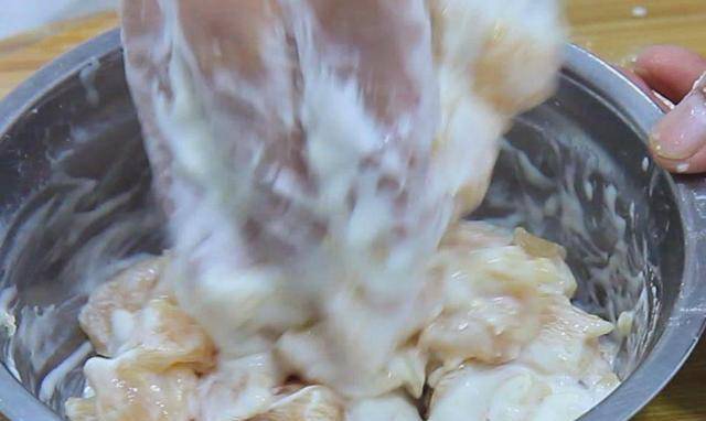 3、拿两个小盆,把鸡蛋清和鸡蛋黄分开,鸡蛋清里面放入适量的玉米淀粉,用手顺着一个方向调匀形成稠糊,鸡蛋清和淀粉都可以使鸡丁的口感更加滑嫩,然后把稠糊放入鸡丁里面,再次搅拌调匀。