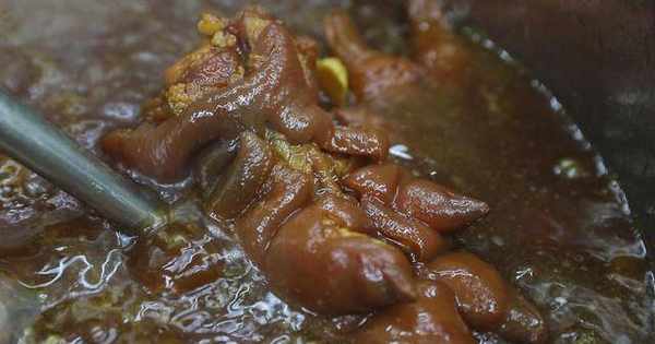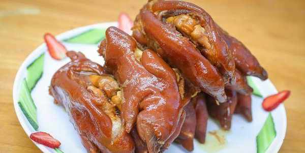 7、盖上锅盖,先大火烧开,再转中火焖煮一个小时,让猪蹄充分的上色、入味。一小时以后猪蹄已经卤熟了,一掀锅盖全部肉香味,皮弹肉糯,红润油亮,这个时候先不要着急出锅,再关火焖上40分钟,更加软烂好脱骨。