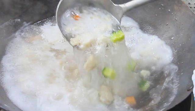 4、接着,我们把鸡丁,黄瓜丁和胡萝卜丁焯水:锅内烧水,放入料酒5克,水烧开以后,再放入鸡丁,然后用勺子搅动鸡丁,再放入黄瓜丁和胡萝卜丁,一起焯水半分钟即可倒出控水备用。