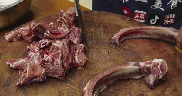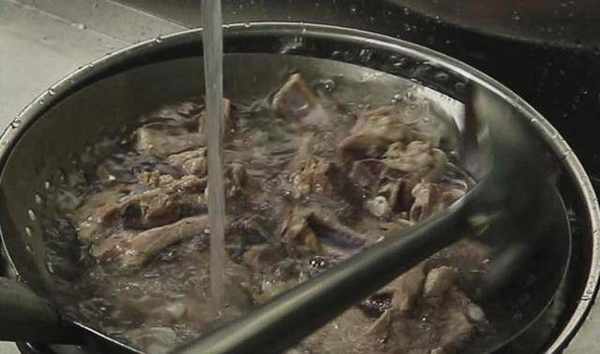 2、起锅烧水,加入料酒,凉水下入排骨煮出血沫,水开后煮2-3分钟,捞出冲洗干净控干水分备用。