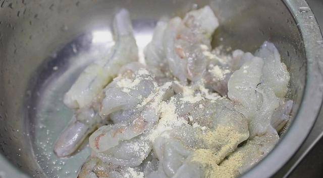 3、鲜虾仁沿虾背片开,用清水冲洗干净,去除里面的虾线,然后把虾仁腌一下,加入少许食盐、胡椒粉、鸡粉,淋入料酒去腥,抓拌均匀,提前码上底味,再抓入一小撮淀粉拌匀,锁住水分,放在一边腌制5分钟。