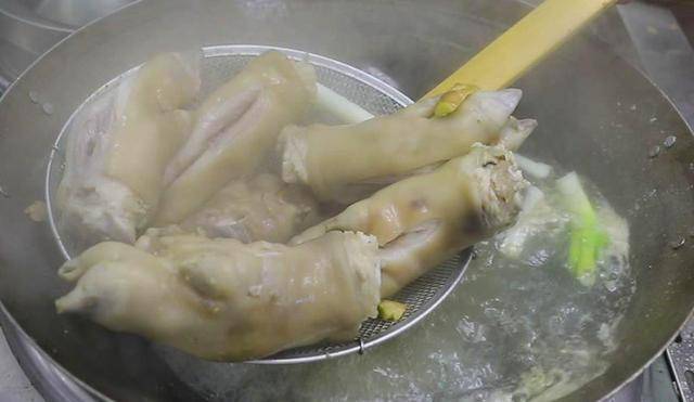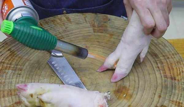 1、猪蹄洗干净,洗好以后用喷枪逐个烤一遍,去除残留的根,夹缝的地方一定要着重处理,这样吃的时候才不会有皮腥味。烤至皮焦黄就可以了。全部处理好以后再次用清水洗干净,用刀把上面的黑边刮干净,以免吃着发苦。