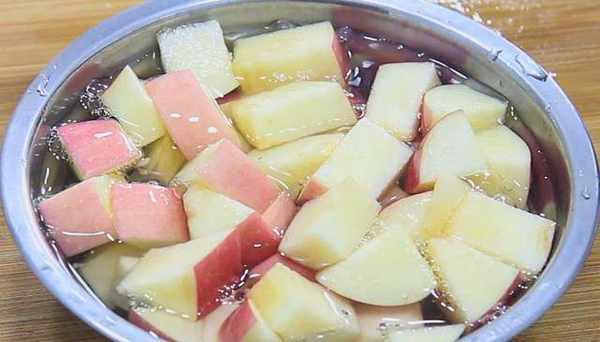 2、下面,我们把鸡丁腌制一下:在鸡丁中放入食盐2克(一勺)、料酒3克,放入料酒可以减少鸡丁的腥味,用手抓匀以后备用。苹果丁里面放入清水适量,加入食盐1克(半勺)。