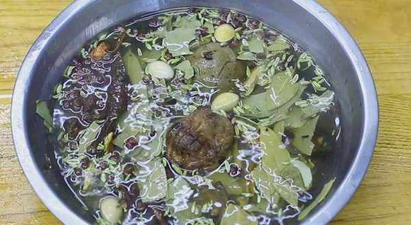 3、罗汉果个头比较大,把它拍扁、切碎,然后一起放在盆中,淋上高度白酒激发香味,再倒入温水浸泡5分钟,去除香料的药和苦涩味。
