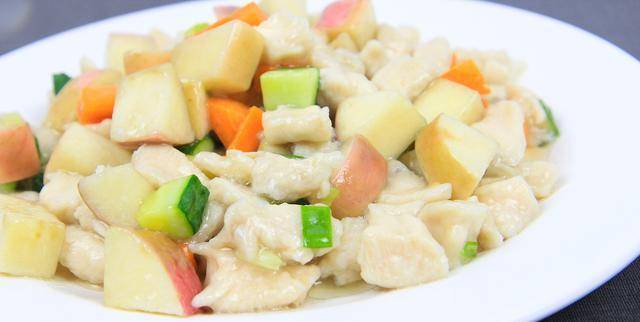 6、调味:放入食盐2克(一勺),鸡粉2克(一勺),胡椒粉1克(半勺)、白糖3克(一勺)鸡汁2克,翻炒化开调料以后放入苹果丁继续翻炒,淋入少许水淀粉,使食材和调料更好的融合在一起,淋入适量的明油,使食材更加鲜亮,翻匀后即可出锅装盘。