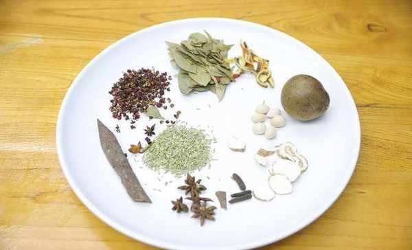 2、洗干净的猪蹄从中间破开,不要完全切开,切条缝,更容易卤熟、入味。酱猪蹄用的香料有:白果6克、罗汉果一个、白芷10克、荜拨4克、八角5克、桂皮8克、小茴香10克、花椒10克、香叶8克、陈皮5克。
