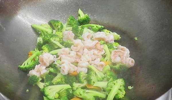 7、这个时候放入西蓝花,颠锅翻炒均匀,给西蓝花入味,再放入虾仁,芶入一点水淀粉和芝麻香油,让调料更好的包裹在食材上面,提亮增香。继续翻匀后即可出锅。