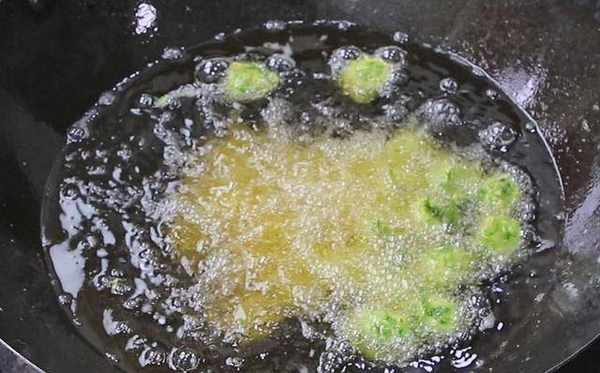 3、馅料调好以后,我们开始炸丸子。锅内烧油,油温5成热,起锅下丸子,抓一把馅料,在虎口处挤出丸子,然后用勺子把丸子挖出放入锅中,丸子下完以后,再开始加热。