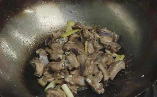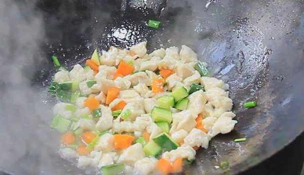 5、锅内烧油,油热以后,放入葱花和姜片一起翻炒,翻炒出香味以后,放入鸡丁,胡萝卜丁和黄瓜丁继续翻炒。