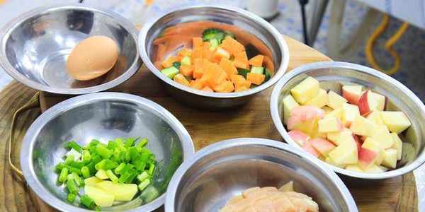 1、鸡脯肉一块,从中间片开,切成小丁放在盆中备用,苹果一个,切成四半,切去中间的核,再切成小丁,黄瓜一段,切成小丁备用,胡萝卜一段,也同样切成小丁与黄瓜丁一起放在盆中,生姜一块切成姜片,小葱两根切成葱花。