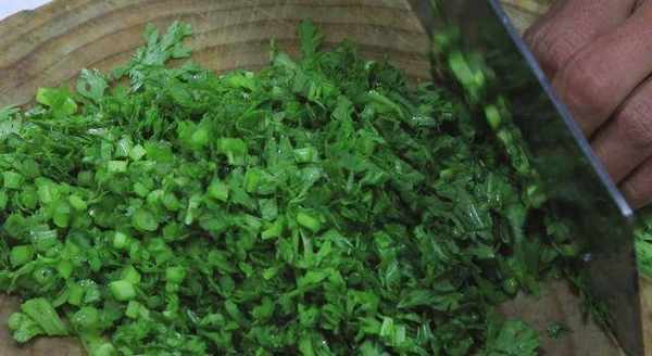 1、新鲜的茼蒿一把,放入盆中,反复的清洗干净以后控干水分备用。控干水分的茼蒿从中间切开,切成碎粒。