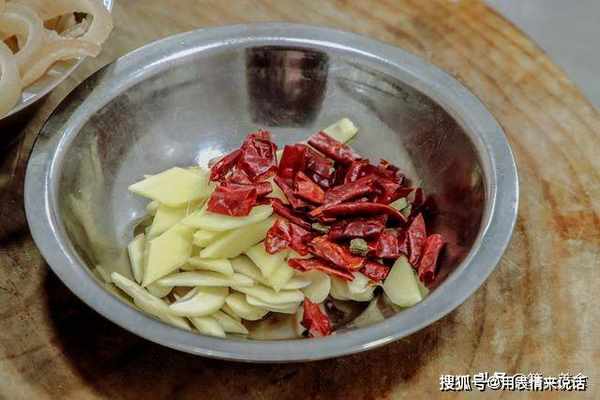 5.大蒜几粒切成片,生姜一块切成菱形片,再放入一把干辣椒备用。