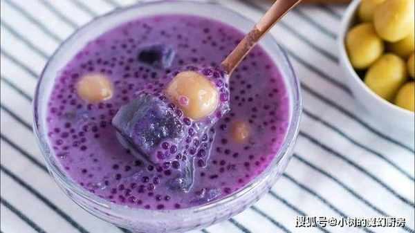 另外准备西米,将它放在锅中煮5分钟,捞起来后过滤水分,重新烧开一锅热水,将碾碎的紫薯放进去,进一步捣碎捣融化,变成紫薯糊之后,就可以放入西米、冰糖、椰奶等,煮沸后就可以了。如果想要口感更佳,可以冰冻一会再吃。