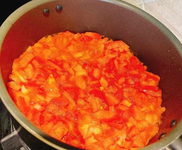 2、西红柿两个洗净切成小丁。起锅烧油,把西红柿倒进去,炒出汤汁,调入一点点生抽,接着加入热水烧开。热水可以节省很多时间。