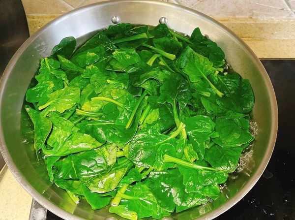 2、准备几棵菠菜,清洗干净,在开水中烫十几秒钟捞出。