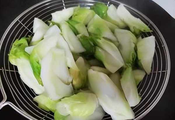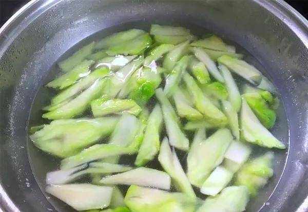 2.炒锅内加入适量的清水大火烧开,水烧开后在里面加入一勺食用油。然后再放入少许的小苏打。把准备好的儿菜放入锅内。用大火汆烫20秒后立即捞出。放入冷水中控凉。