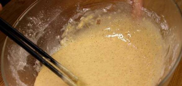 清洗之后蘑菇其实吸了很多的水,水多了是不适合油炸的,需要用手攥干蘑菇里面的水分。然后在碗中加入两勺左右的面粉和三个鸡蛋,炸蘑菇的面糊一定要鸡蛋多面粉少,不然炸出来吃着比较硬。然后在面糊中加入食盐、鸡精、孜然以及五香粉,充分的搅拌均匀。