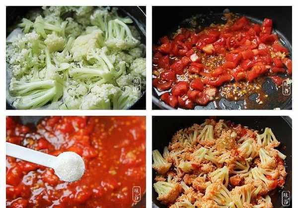 【食材】:花菜适量、白糖1小勺、盐少许、鸡精少许、番茄3个、番茄酱3勺、姜蒜适量、葱适量、