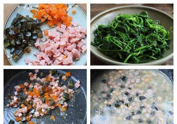【食材】:豆苗适量、咸蛋黄2个、盐1小勺、火腿半个、皮蛋1个、蒜末适量