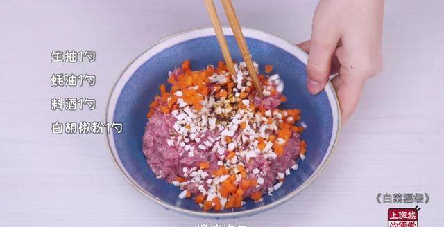 肉馅里加入香菇丁、胡萝卜丁、1勺生抽、1勺蚝油、1勺料酒和1勺白胡椒粉,搅拌均匀。