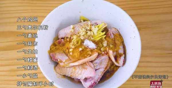 奥尔良鸡翅的灵魂,当然是奥尔良腌料,超市和网上2块钱一包,可以做好几顿,腌得越久越入味(8个鸡翅、3勺奥尔良粉、1勺姜丝、1勺蒜末、1勺生抽、1勺蜂蜜、1勺料酒、1小勺盐)拌匀腌制半小时。