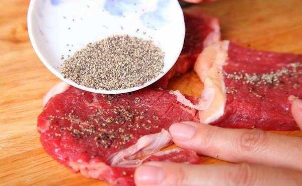 上面撒上大量黑胡椒粒,直接用手拍打,让黑胡椒更入味。