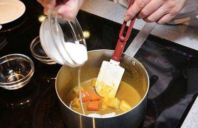 将步骤1锅子离火降温,倒入咖喱粉后,以小火拌炒至香味出来。