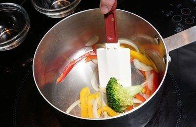 以中大火炒洋葱丝、青花菜、红&黄椒甜丝,约90秒变软出水后起锅,加入少许盐,取出备用;同一锅转小火,拌炒洋葱丁,直到成半透明状。