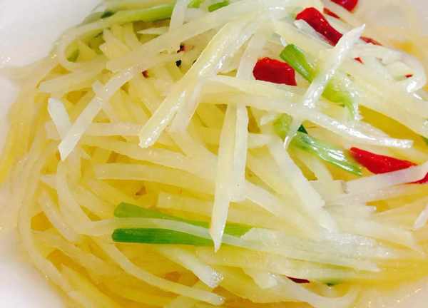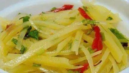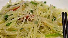 3、起锅烧油,油温起来,倒入葱小米辣,炒香,再把土豆丝倒进来,加入盐,鸡精,香醋,翻炒1分钟左右,即可出锅装盘了,