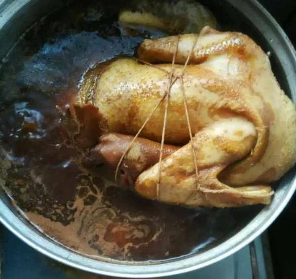 2..在卤锅中入精盐、老抽、糖色保持锅中卤汁沸而不腾的状态小火熬4小时出香即成。