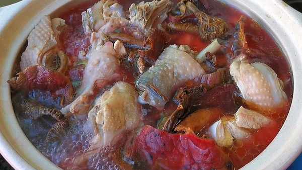 5,取一个干净的砂锅,放入老母鸡块和红菇,再加3片姜片,保持大火把锅中的水烧开。