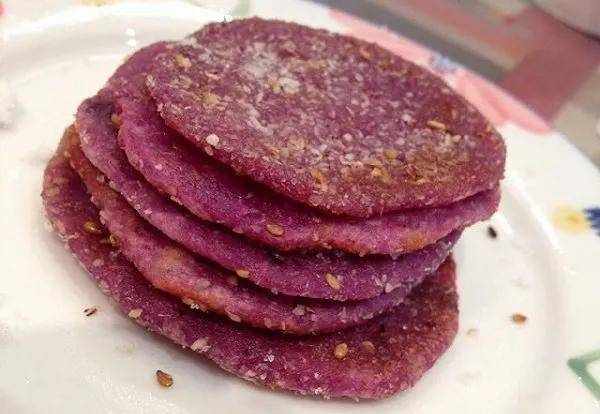 5,起锅倒油,放入紫薯面饼,保持小火,把紫薯饼煎熟即可大功告成。