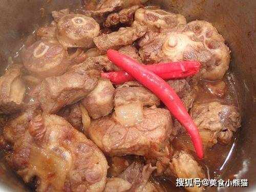 4、放入牛腩及牛尾,炒至表面上色。