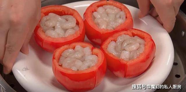 5.虾仁腌好之后,放进西红柿碗里面,再按压平整。