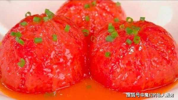 9.时间到,西红柿蒸好出锅,倒扣过来,剥去外皮,淋上熬好的料汁,再撒上葱花点缀,这样一道西红柿蒸虾仁就做好了。