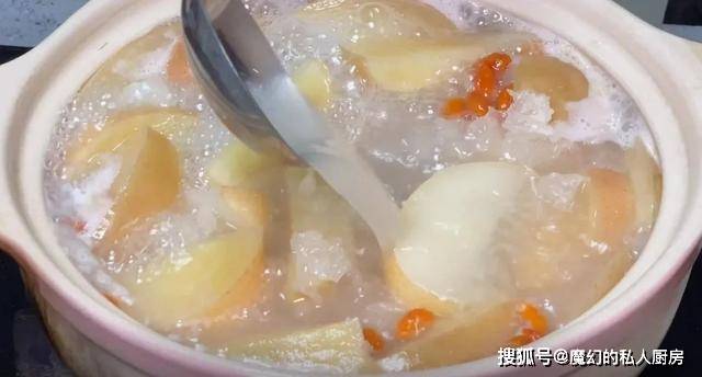 6.时间到,打开盖子,放一小把枸杞,再放几粒冰糖,一小勺盐,调料煮匀后即可出锅享用,秋天多喝一些水果汤可以美容养颜哦!