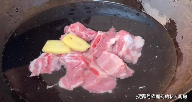 3.排骨冷水下锅焯水,放姜片、料酒去腥,血沫煮出后夹出清洗干净。