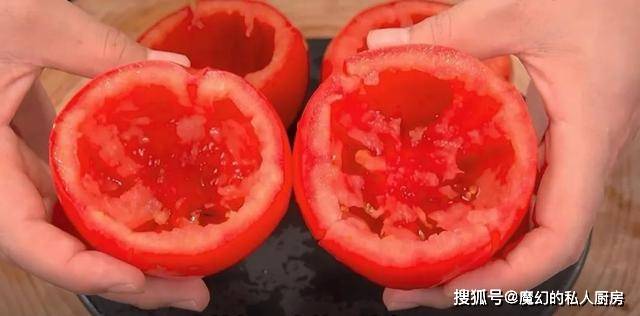 3.切去西红柿根,挖出里面的果肉,这样就得到一个西红柿碗,全部挖好备用。