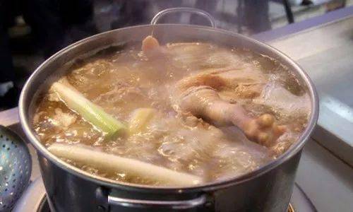2、所有的新鲜原料分别剁成大块,放入沸水中焯透,捞出放入不锈钢桶内,倒入清水140千克,下入胡椒粒、陈皮各30克,鱼骨1千克,老姜80克,大火烧开,中火熬4小时,再改用大火收汤60分钟,起头汤35千克,离火后自然冷却,过滤汤汁即可。