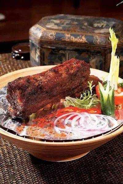此菜把牛肋骨经过简单的腌渍后,放入烧鹅炉内烤制,成品外酥里嫩,保留了本身的香味。上菜时,将牛肋骨放在灼热的雨花石上,既可以保温,又让菜品看上去时尚大方。