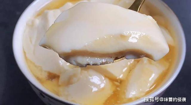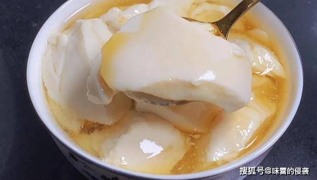 9.用勺子挖进碗里,淋上自制的糖浆,一碗豆腐花就做好了,入口即化,豆香浓郁。