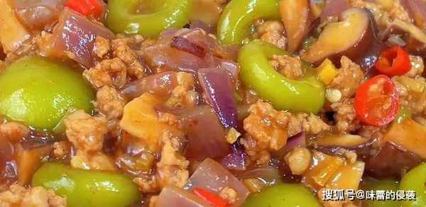 13.下入香菇丁、洋葱丁,加老抽、生抽、胡椒粉、十三香、花椒粉,一起翻炒均匀。