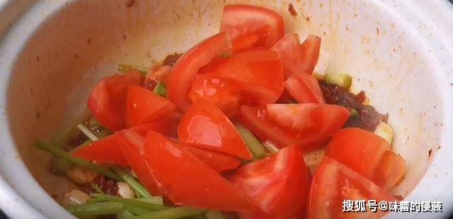 8.放入芹菜、西红柿,开中火炒出汁水。